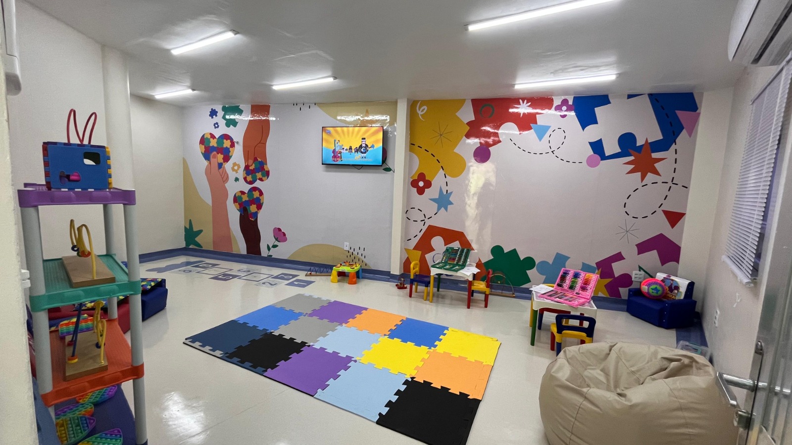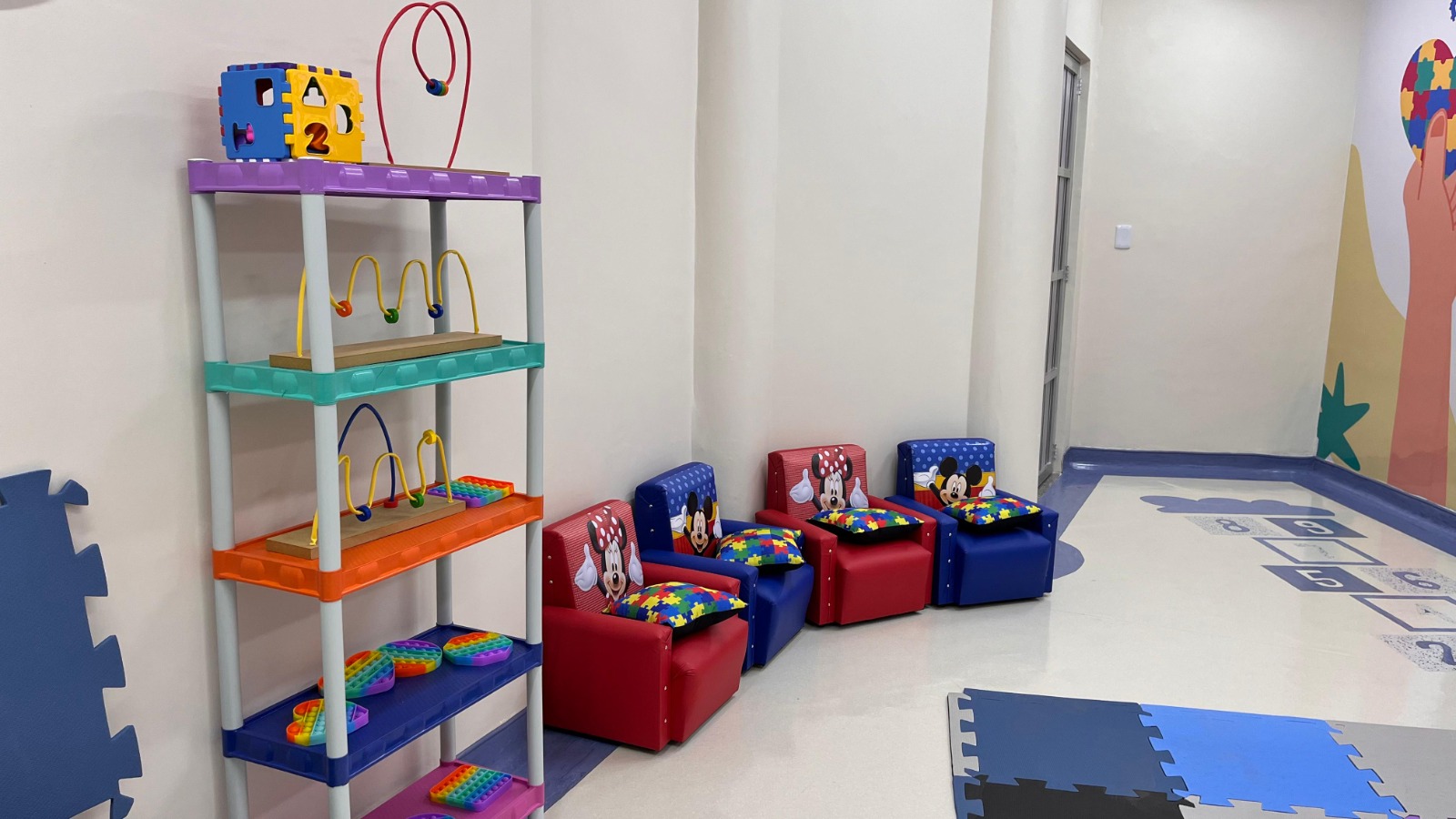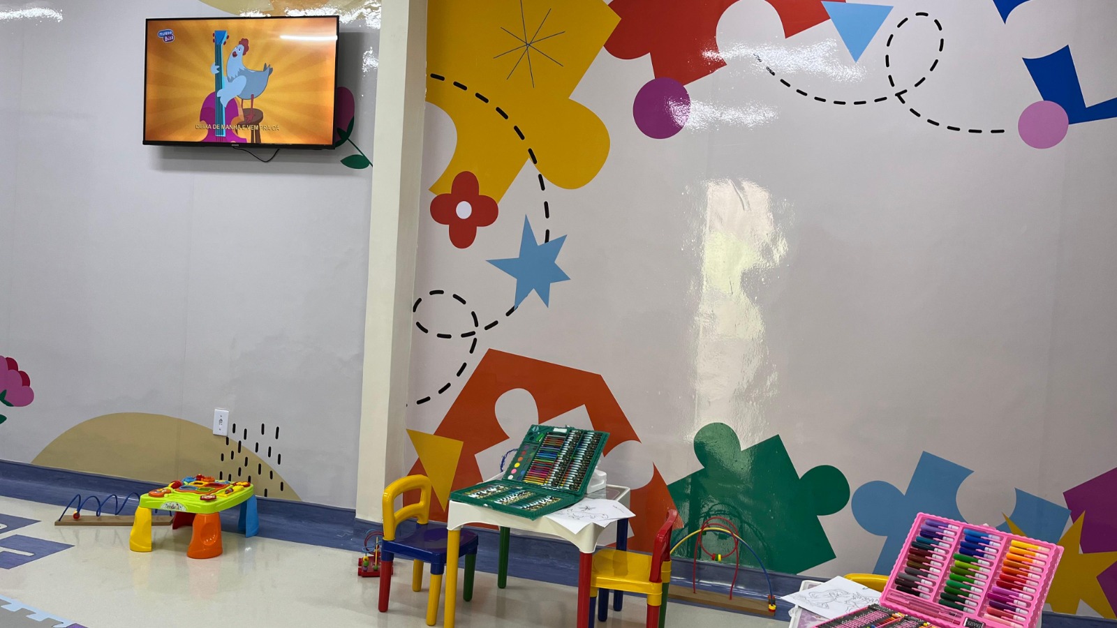 Área de espera oferece atividades lúdicas, contando com brinquedos, música e estímulo à interação
